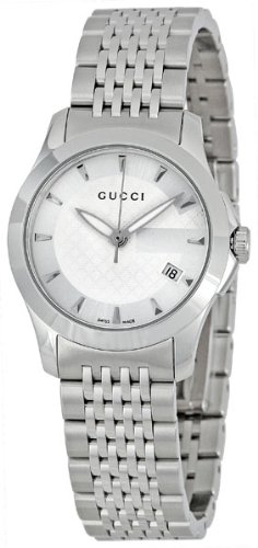 The elegant GUCCI Women's Timeless Watch features a circular, silver dial with a diamond-pattern that displays wide, silver-toned hands along with silver-toned, bar-shaped hour indexes, and a date display at the four o'clock position. The stainless steel bezel and case frame the dial and provide strength and durability. Made from synthetic sapphire, the crystal window offers ultimate scratch resistance. The sleek, stainless steel bracelet is secured with a deployment clasp for added security. Equipped with high-quality Swiss quartz movement, this refined timepiece is ideal for daily wear and is water resistant to 99 feet (30 meters).